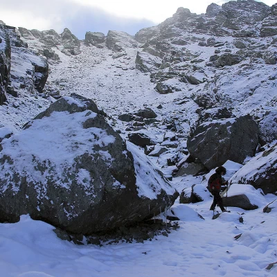 From the Pescegallo chair lift forecourt 1454m, follow the ski lift service track (or its signposted shortcuts) to Rifugio Salmurano alle Foppe di Pescegallo 1848m; continue through the pastureland along the line of the ski lift to its end. Behind the arrival building, the path climbs for a few dozen metres before forking: choose the left-hand branch which, after a few bends and a traverse, reaches Passo d'Avaro 2099m (or Passo Salmurano Orientale). The pass is a short trench in the ridge line that joins the path connecting Rifugio Benigni to Cà San Marco (n. 101). Continue eastwards with a level traverse that takes you to a grassy shoulder (with a fine view of the Vallone di Salmurano, Rifugio Benigni, the Piazzotti group and, further away, the Mezzaluna ridge), where the path loses a hundred metres in altitude. A second level traverse enters a valley at the base of Monte Valletto, which becomes increasingly stony until you reach the bottom near some boulders used as shelters for grazing animals. The next section recovers the height difference to a pastureland plateau with a small lake 1997m near the grassy summit of Monte Avaro 2088m. Disregard the signs for path 109A, which turn upwards. The traverse, continuing eastwards, is reached from the valley by a path coming from the visible Piani d'Avaro; when you reach a crest with signs, leave the path towards Cà San Marco and ascend the ridge until you reach the two adjoining basins of Laghi di Ponteranica 2105m. The path back to Valgerola follows a less marked but still clearly visible track (a few rare remnants of faded paint markings): with the right choice of ascent among scree, steep streams and rocky outcrops, the path tends to a grassy saddle to the right of a voluminous cairn of stones. The ridge - which cannot be climbed in this section - must be followed to the right and, past a second cairn, with a short, exposed descent, reaches a narrow notch: a few delicate steps and the summit scree of the gully between the Pizzi di Ponteranica (western 2353m and eastern 2378m) is reached. Dominated on the left by the rocky towers of Monte Valletto, descend the large, very mobile debris following a series of precarious cairns to the bottom of the gully. The track, meandering now among large boulders, comes in sight of the artificial reservoir of Pescegallo 1865 m: you reach an isolated hut and, a little further on, the marked path coming from above Forcellino (a pass linking Valgerola and Val Bomino). Follow it towards the valley as far as the dam wall: beyond the crossing proceed on the service track as far as Casera Pescegallo Lago 1778 m, where a stony and steep mule track starts (just to the side of the track) which soon descends to the parking areas.