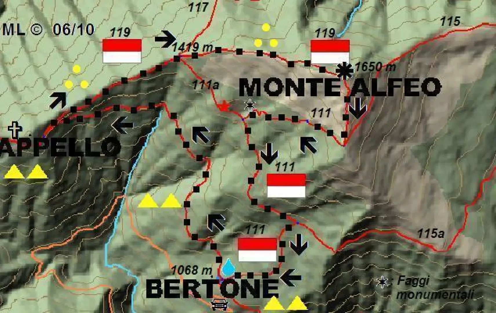 Da Bertone, si sale tra le case e in 2’, vicino a una fonte, si piega a sinistra in piano, passando sotto un archivolto (2 triangoli gialli e non i simboli CAI che si utilizzano al ritorno). La mulattiera sale abbastanza dolcemente, fino a trovare una vasca con tritoni (acqua non potabile), poi più avanti si abbandona improvvisamente (quasi 1h dalla partenza - se si arriva da un pilone votivo in pietra allora vuol dire che si è superato l'incrocio e bisogna tornare indietro brevemente...) per piegare a destra su un sentierino appena accennato (tre punti gialli e bandierina bianco rossa cai 119). All’inizio, la traccia ha poca pendenza e dopo un po’ si osserva la cresta che condurrà fino al monte Alfeo …ma, dopo 20’, si arriva ad un importante incrocio (1419 m) evidenziato da una palina con tutte le indicazioni. Si prosegue dritti con la via che si impenna in maniera molto, molto decisa… Il tracciato, ora, è ripidissimo e si fiancheggiano sulla sinistra una serie di alberi tutti contorti e piegati dal vento, che incessante soffia (e facilita rimontare il pendio anche quando più in basso è caldo…). In altri 45’, si è la vetta (tot 2h – 2h15’), alta1650 m. Dalla cima il panorama è vasto… si nota subito la via del ritorno per chiudere l’anello e spicca l’osservatorio radar per il traffico aereo sul monte Lesima. Dopo la pausa, si scende con i simboli cai n. 111, attraversando un bosco di faggi, con alcuni esemplari di notevoli dimensioni… tanto che per un albero sono necessarie quattro signore per coprire la circonferenza... !!!!!!. Il ritorno è veloce (circa 1h15 – 1h30). In tutto, si hanno quasi 600 m di dislivello e una percorrenza totale di circa 3h15 – 3h45. Invece, come sviluppo chilometrico, si è sui 5\6 km e non di più… Volendo allungare notevolmente la gita, si può partire a piedi direttamente da Gorreto (una scritta su un muro parla dell’Alfeo, ma ora i simboli FIE non passano più x la vetta). I 2 triangoli gialli arrivano poi a Bertone (+ 500 m di dislivello e circa + 3h sul tragitto della gita A/R). Ma questa ultima estensione, in piena estate, può far patire il caldo...