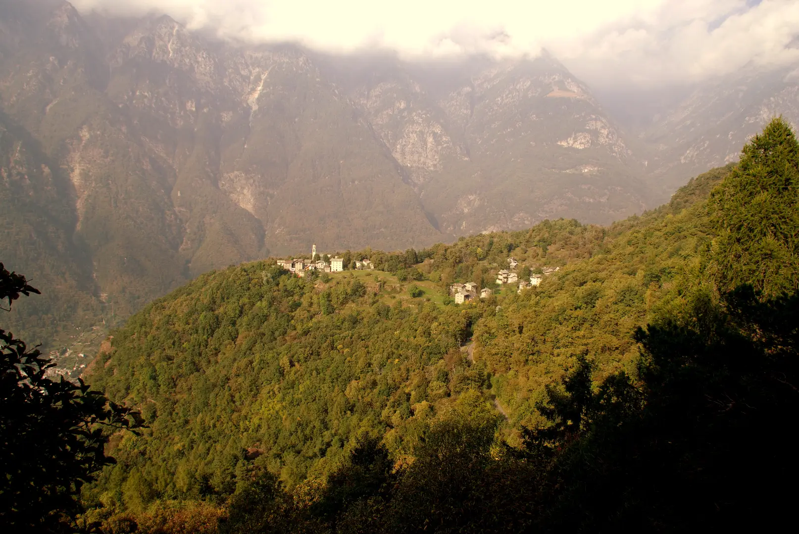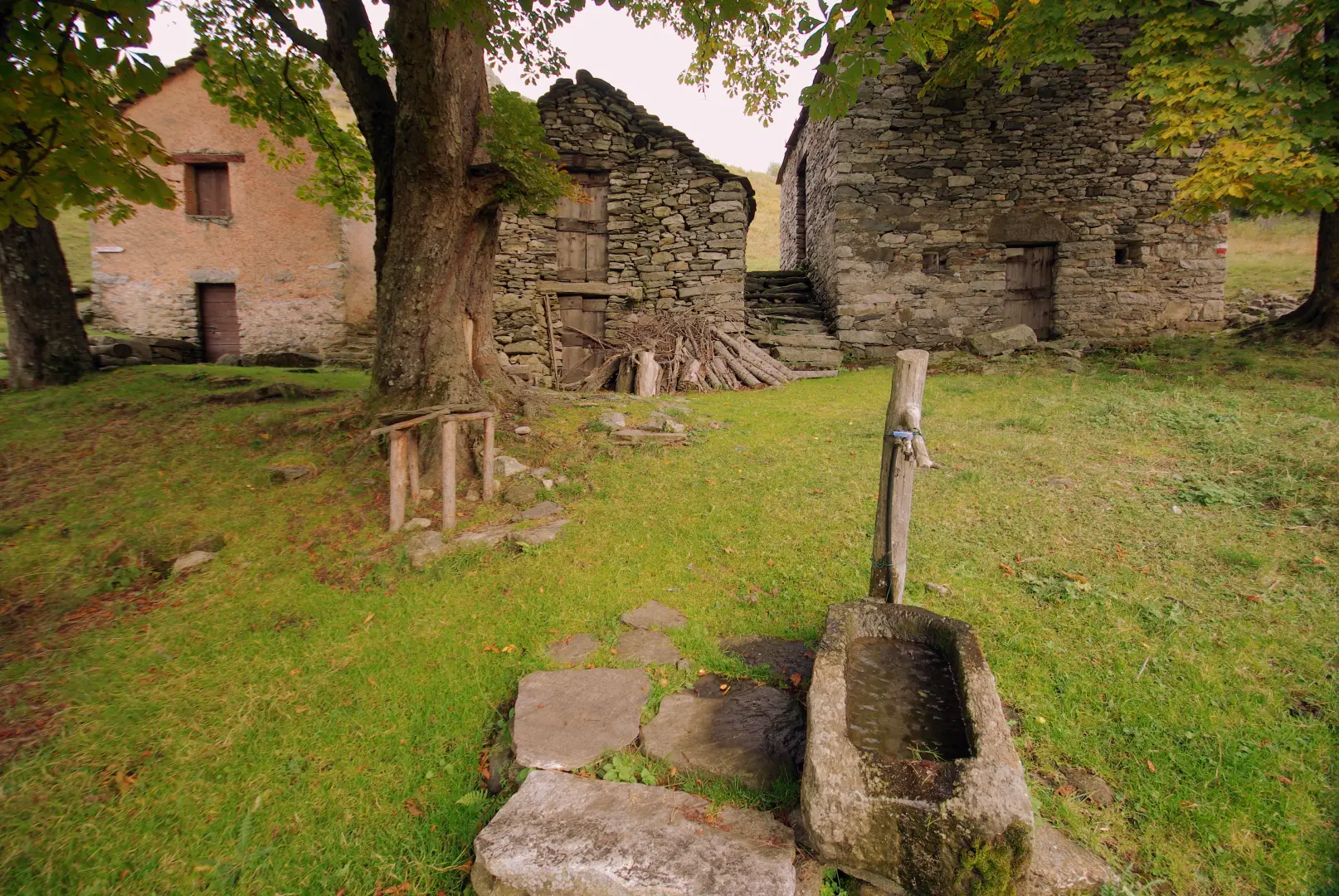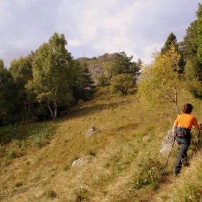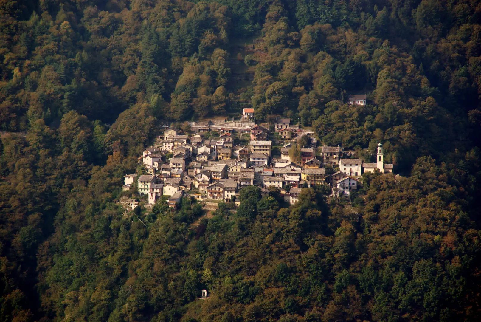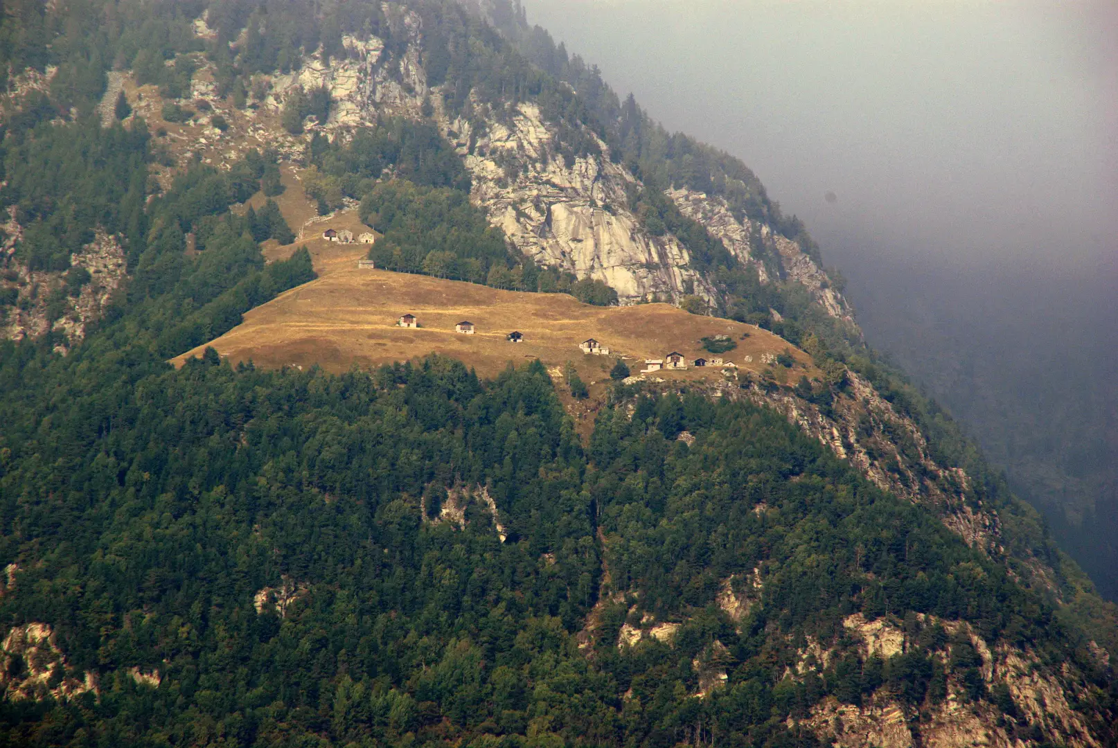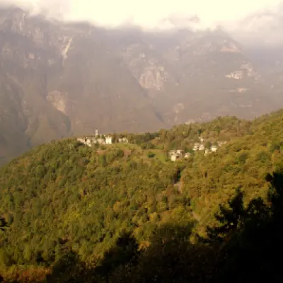Dalla sbarra che impedisce il transito ai non residenti si prosegue sulla strada asfaltata per Uschione ("Us-cion") 832 m per alcune centinaia di metri fino ad un bivio: si sale a destra, ma molto brevemente. Alla fine del muro di sostegno della strada (una ventina di metri) comincia il sentiero ben segnalato che dobbiamo seguire; all'inizio pianeggiante, si inoltra in una selva (localmente è un bosco terrazzato adibito alla selvicoltura) di castagni che poi si dirada fra i massi di una paleofrana. Facendo attenzione, si noteranno sotto i blocchi più grandi scalette, terrazzini con panche e tavoli di pietra all'imbocco di pertugi chiusi da una porticina: si tratta dei crotti, cavità naturali - ma adattate dall'uomo - dove viene sfruttato il microclima costantemente fresco per la conservazione di salumi, formaggi e vino. Oltrepassati i crotti, il sentiero riparte in salita molto accentuata a tornanti serpeggianti fra gli spazi rimasti liberi fra i massi; risale il luminoso bosco di pini silvestri e betulle, si accosta ad un paio di ruderidi baite e riprende con una nuova serie di tornantini ripidi. In breve si sbuca nella radura dell'Alpe Damino 1240 m; una fascia di vegetazione a felci precede il terrazzo sommitale su cui sembra appoggiata la cuspide del Pizzo Damino ("Al Damin") 1296 m. E' possibile raggiungere la croce commemorativa di vetta seguendo verso sinistra un'ampia cengia a blocchi accatastati. Per il ritorno - abbandonata la segnaletica ben visibile - si prosegue sui prati alti dell'Alpe Damino (Alpe Pizzolungo): bisogna traversare verso est lungo una traccia debole nell'erba alta (pochi tratti di vernice sbiadita). Dopo un centinaio di metri si entra in un umido bosco di abeti e larici: il sentiero diventa ben tracciato e segnalato nel lungo traverso a saliscendi verso Pesceda 1313 m, gruppetto di baite ombreggiate da ippocastani. Ci si presenta un bivio: si tralascia la direzione a monte per cominciare a divallare rapidamente lungo i prati del monte (localmente inteso più o meno come maggengo). La discesa è spesso a picco - come usa da queste parti - lungo scalette di pietra per la linea di massima pendenza. In questo modo, dopo un secondo alpeggio e una nuova fascia di castagneto, ci si ritrova sulla strada per Uschione, duecento metri a monte del punto in cui l'avevamo abbandonata.