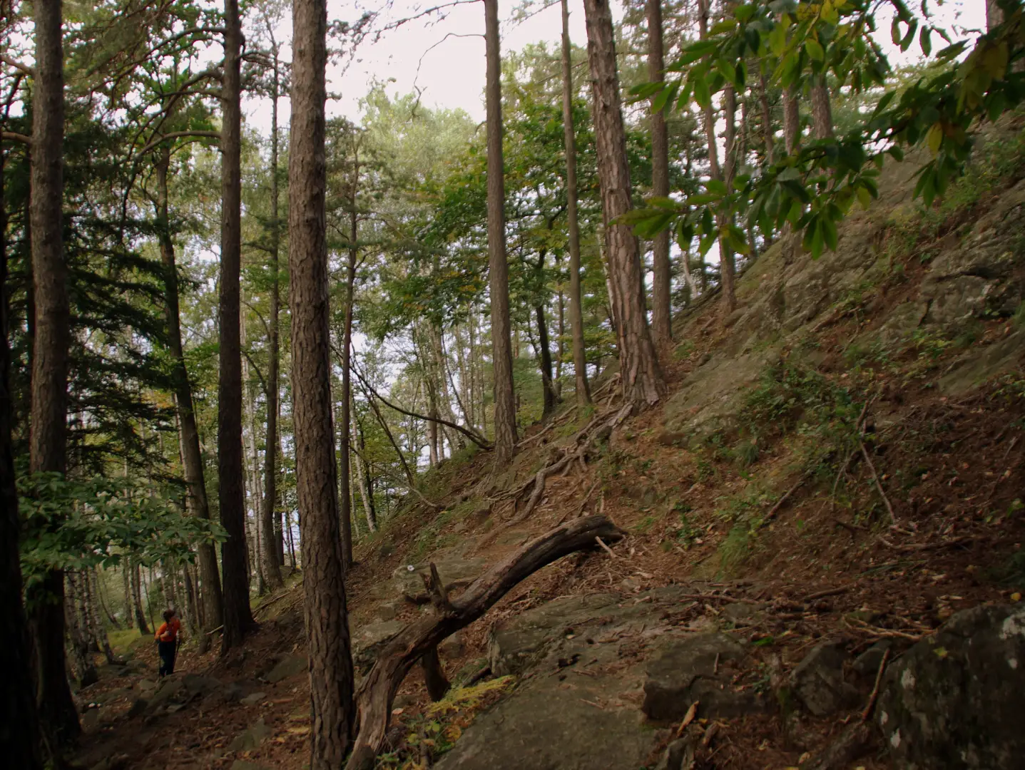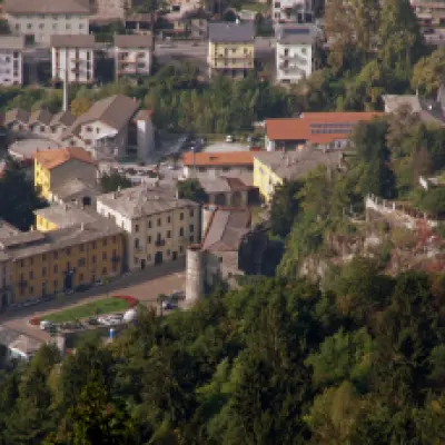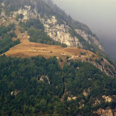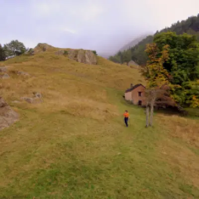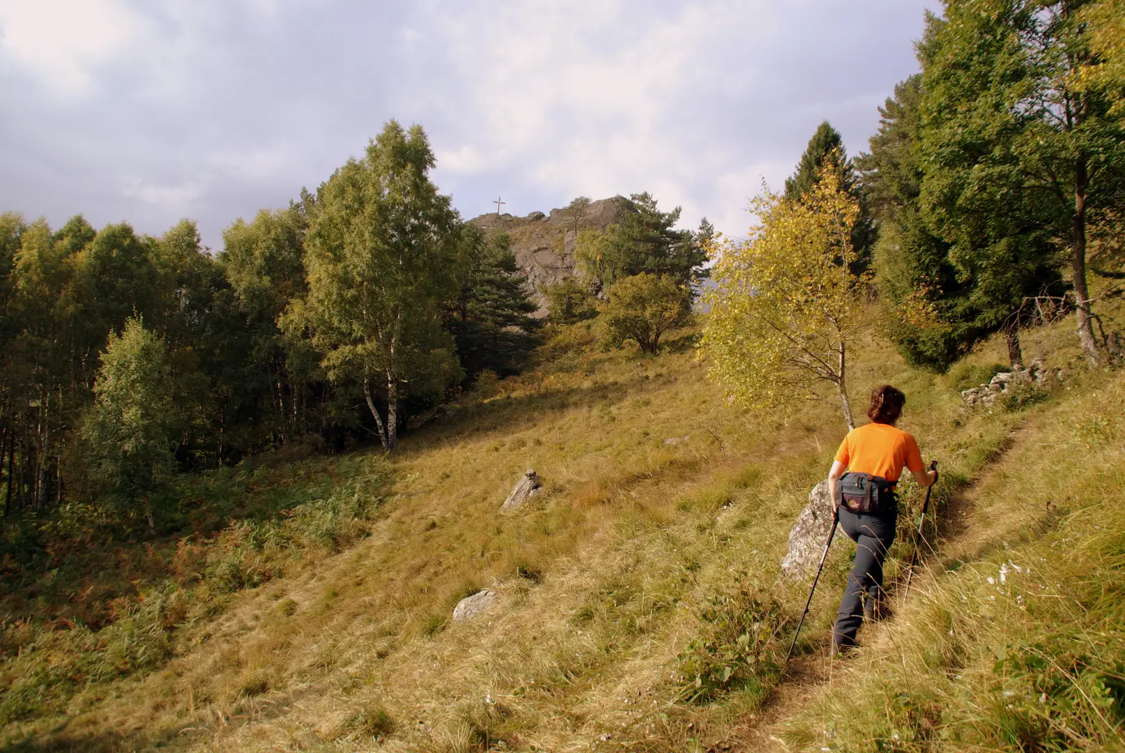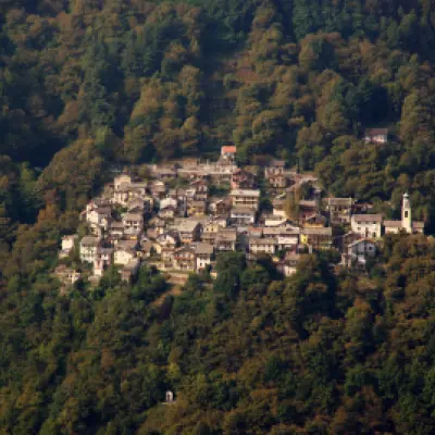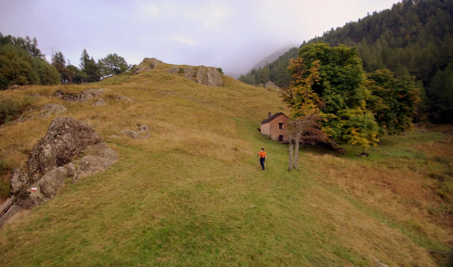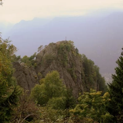 Dalla sbarra che impedisce il transito ai non residenti si prosegue sulla strada asfaltata per Uschione ("Us-cion") 832 m per alcune centinaia di metri fino ad un bivio: si sale a destra, ma molto brevemente. Alla fine del muro di sostegno della strada (una ventina di metri) comincia il sentiero ben segnalato che dobbiamo seguire; all'inizio pianeggiante, si inoltra in una selva (localmente è un bosco terrazzato adibito alla selvicoltura) di castagni che poi si dirada fra i massi di una paleofrana. Facendo attenzione, si noteranno sotto i blocchi più grandi scalette, terrazzini con panche e tavoli di pietra all'imbocco di pertugi chiusi da una porticina: si tratta dei crotti, cavità naturali - ma adattate dall'uomo - dove viene sfruttato il microclima costantemente fresco per la conservazione di salumi, formaggi e vino. Oltrepassati i crotti, il sentiero riparte in salita molto accentuata a tornanti serpeggianti fra gli spazi rimasti liberi fra i massi; risale il luminoso bosco di pini silvestri e betulle, si accosta ad un paio di ruderidi baite e riprende con una nuova serie di tornantini ripidi. In breve si sbuca nella radura dell'Alpe Damino 1240 m; una fascia di vegetazione a felci precede il terrazzo sommitale su cui sembra appoggiata la cuspide del Pizzo Damino ("Al Damin") 1296 m. E' possibile raggiungere la croce commemorativa di vetta seguendo verso sinistra un'ampia cengia a blocchi accatastati. Per il ritorno - abbandonata la segnaletica ben visibile - si prosegue sui prati alti dell'Alpe Damino (Alpe Pizzolungo): bisogna traversare verso est lungo una traccia debole nell'erba alta (pochi tratti di vernice sbiadita). Dopo un centinaio di metri si entra in un umido bosco di abeti e larici: il sentiero diventa ben tracciato e segnalato nel lungo traverso a saliscendi verso Pesceda 1313 m, gruppetto di baite ombreggiate da ippocastani. Ci si presenta un bivio: si tralascia la direzione a monte per cominciare a divallare rapidamente lungo i prati del monte (localmente inteso più o meno come maggengo). La discesa è spesso a picco - come usa da queste parti - lungo scalette di pietra per la linea di massima pendenza. In questo modo, dopo un secondo alpeggio e una nuova fascia di castagneto, ci si ritrova sulla strada per Uschione, duecento metri a monte del punto in cui l'avevamo abbandonata.