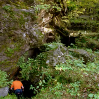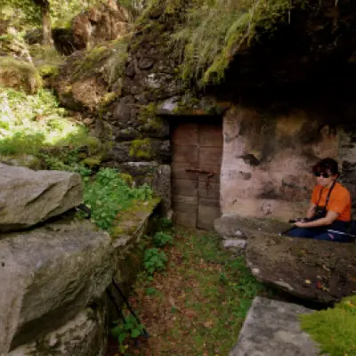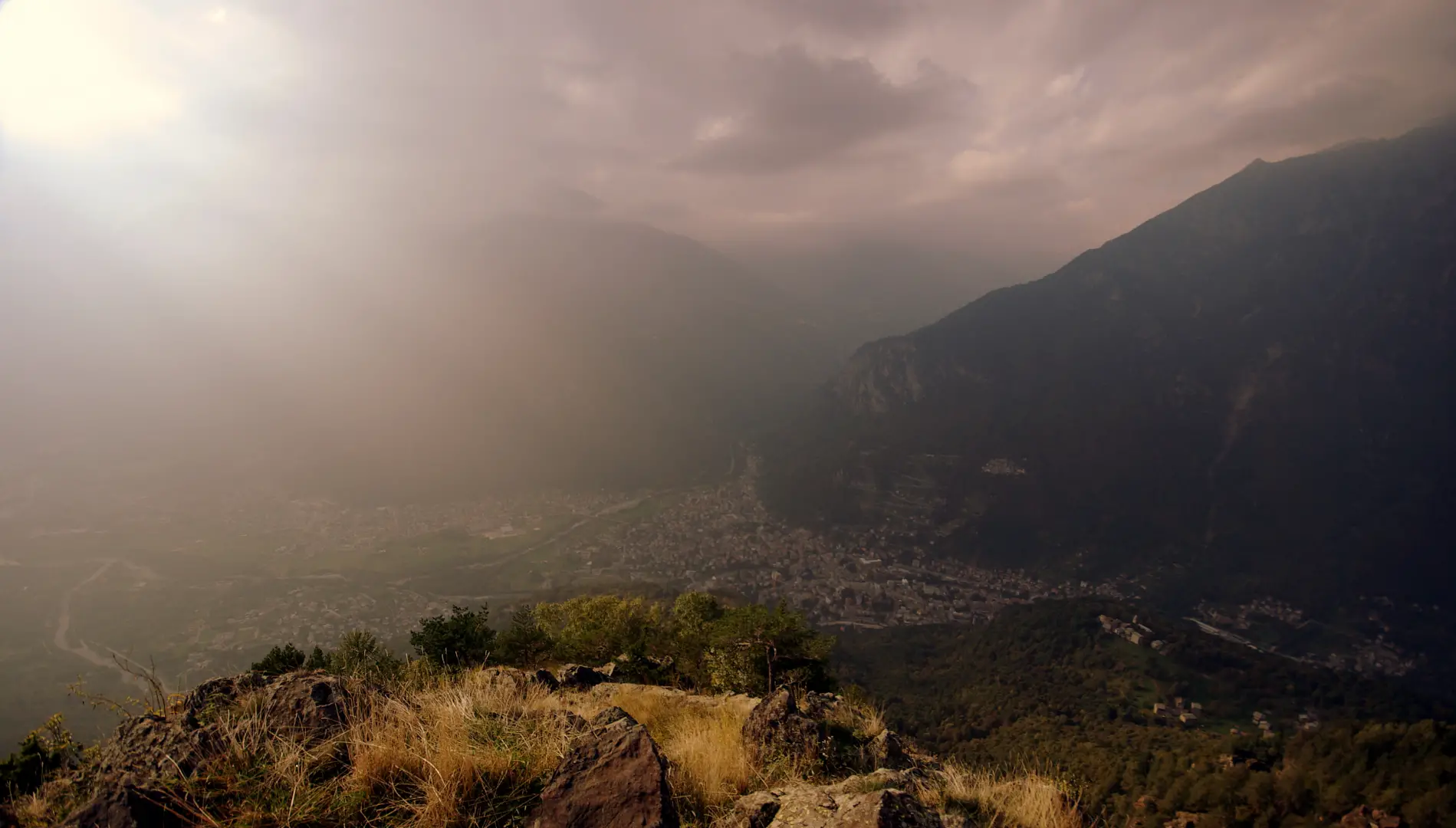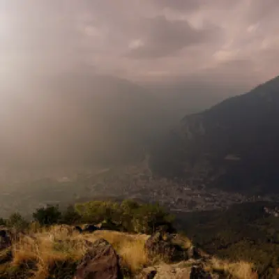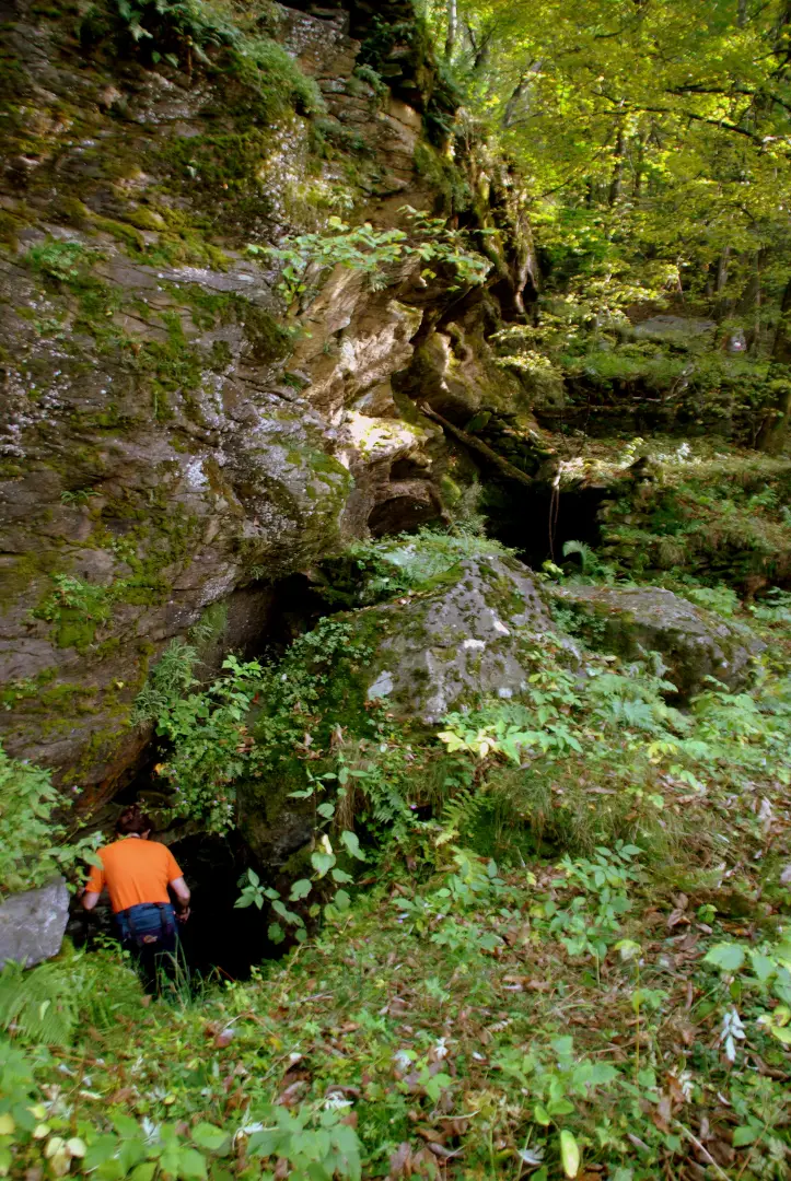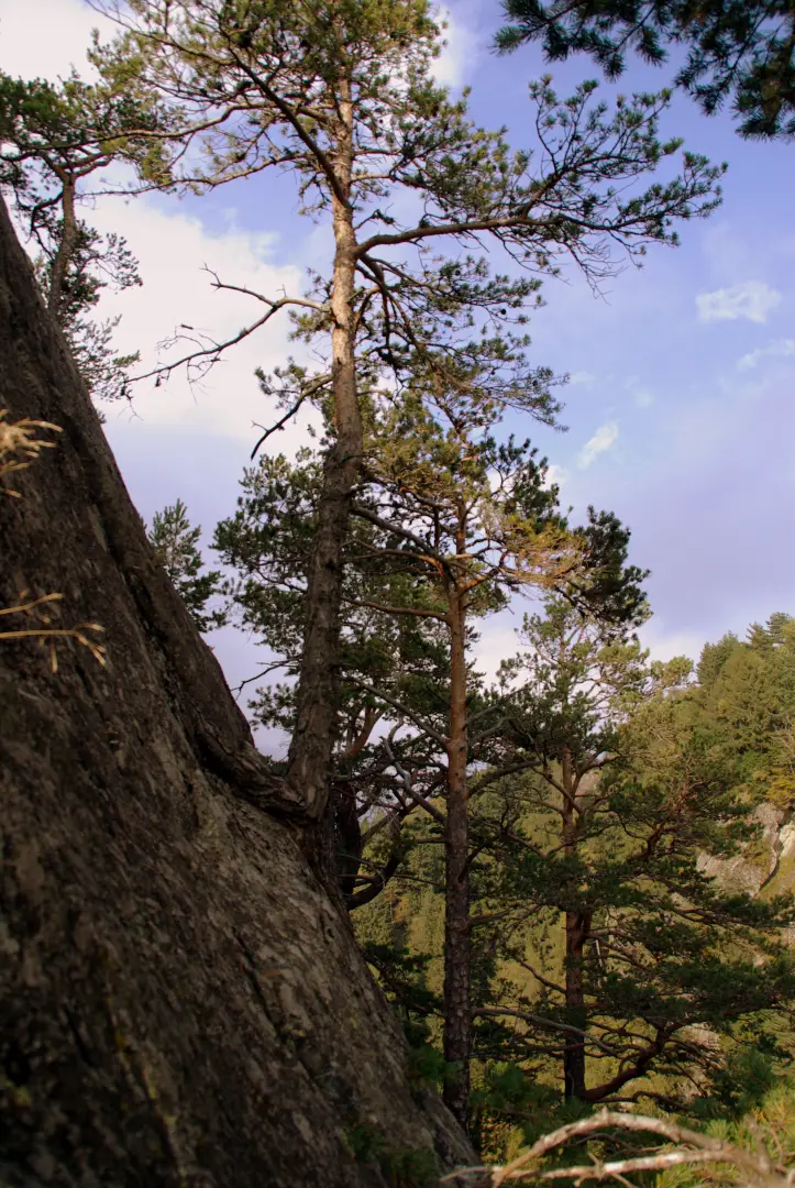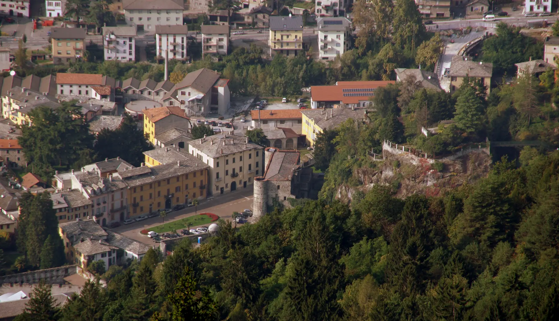 Dalla sbarra che impedisce il transito ai non residenti si prosegue sulla strada asfaltata per Uschione ("Us-cion") 832 m per alcune centinaia di metri fino ad un bivio: si sale a destra, ma molto brevemente. Alla fine del muro di sostegno della strada (una ventina di metri) comincia il sentiero ben segnalato che dobbiamo seguire; all'inizio pianeggiante, si inoltra in una selva (localmente è un bosco terrazzato adibito alla selvicoltura) di castagni che poi si dirada fra i massi di una paleofrana. Facendo attenzione, si noteranno sotto i blocchi più grandi scalette, terrazzini con panche e tavoli di pietra all'imbocco di pertugi chiusi da una porticina: si tratta dei crotti, cavità naturali - ma adattate dall'uomo - dove viene sfruttato il microclima costantemente fresco per la conservazione di salumi, formaggi e vino. Oltrepassati i crotti, il sentiero riparte in salita molto accentuata a tornanti serpeggianti fra gli spazi rimasti liberi fra i massi; risale il luminoso bosco di pini silvestri e betulle, si accosta ad un paio di ruderidi baite e riprende con una nuova serie di tornantini ripidi. In breve si sbuca nella radura dell'Alpe Damino 1240 m; una fascia di vegetazione a felci precede il terrazzo sommitale su cui sembra appoggiata la cuspide del Pizzo Damino ("Al Damin") 1296 m. E' possibile raggiungere la croce commemorativa di vetta seguendo verso sinistra un'ampia cengia a blocchi accatastati. Per il ritorno - abbandonata la segnaletica ben visibile - si prosegue sui prati alti dell'Alpe Damino (Alpe Pizzolungo): bisogna traversare verso est lungo una traccia debole nell'erba alta (pochi tratti di vernice sbiadita). Dopo un centinaio di metri si entra in un umido bosco di abeti e larici: il sentiero diventa ben tracciato e segnalato nel lungo traverso a saliscendi verso Pesceda 1313 m, gruppetto di baite ombreggiate da ippocastani. Ci si presenta un bivio: si tralascia la direzione a monte per cominciare a divallare rapidamente lungo i prati del monte (localmente inteso più o meno come maggengo). La discesa è spesso a picco - come usa da queste parti - lungo scalette di pietra per la linea di massima pendenza. In questo modo, dopo un secondo alpeggio e una nuova fascia di castagneto, ci si ritrova sulla strada per Uschione, duecento metri a monte del punto in cui l'avevamo abbandonata.